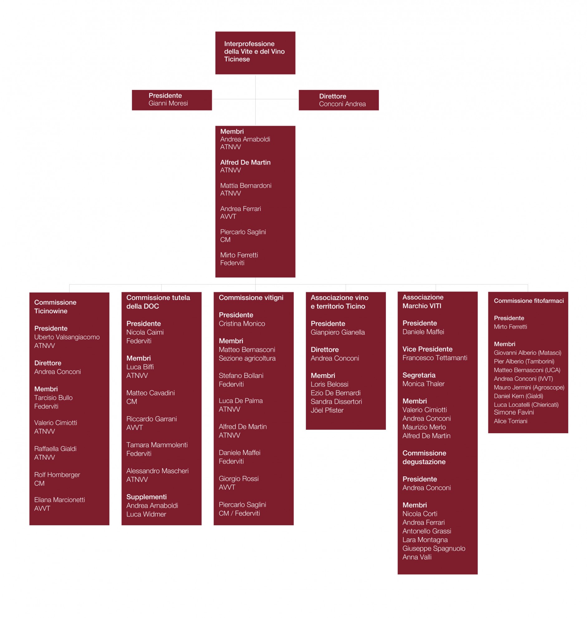 L’Interprofessione della vite e del vino ticinese raggruppa, sotto un unico tetto, tutta la filiera vitivinicola. Diverse commissioni fanno capo al comitato: la Commissione di tutela della DOC, la Commissioni vitigni, la Commissione fitofarmaci, la Commissione Ticinowine – che si occupa della promozione – e l’Associazione vino e territorio Ticino che si occupa della gestione della Casa del vino Ticino.